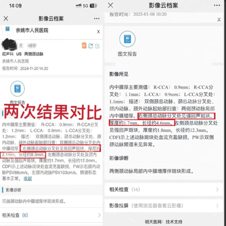 吃了一段时间复查,刘叔叔对结果特别满意!颈动脉斑块从2.1mm*8.3mm下降到了1.7mm*4.6mm。关键就在咱磷虾油里的丰富海洋磷脂:它像 “血管清道夫”,能乳化脂肪,把血管壁上的多余脂肪一点点带走。您想,三高、血管斑块、硬化的根源,不就是这些堆积的脂肪吗?鲁华磷虾油从根上清理,效果看得见!